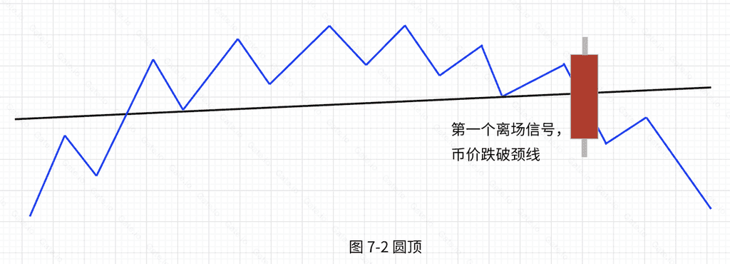 圆顶是一种比较可靠的转势信号,其可靠程度超过圆底。原因也很简单,币价上涨需要资金的推动。而币价下跌,什么也不需要,只要没有人买,价格就会跌。