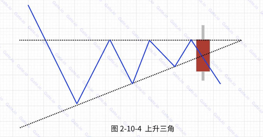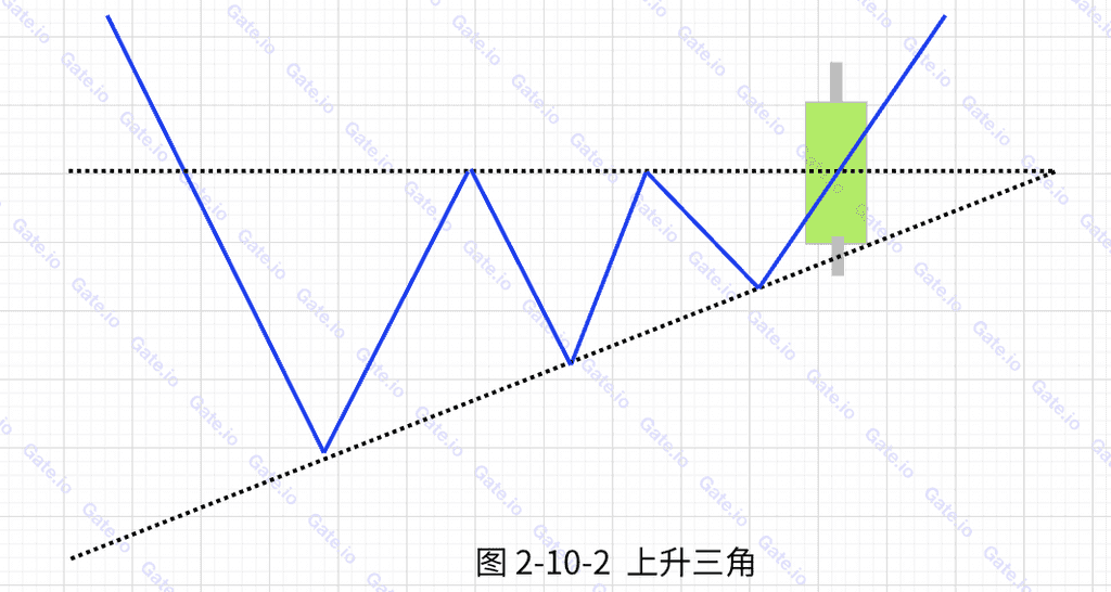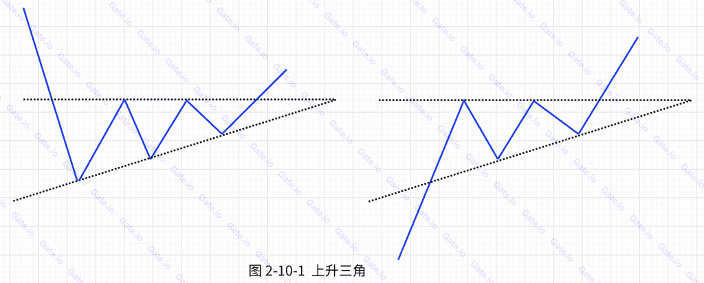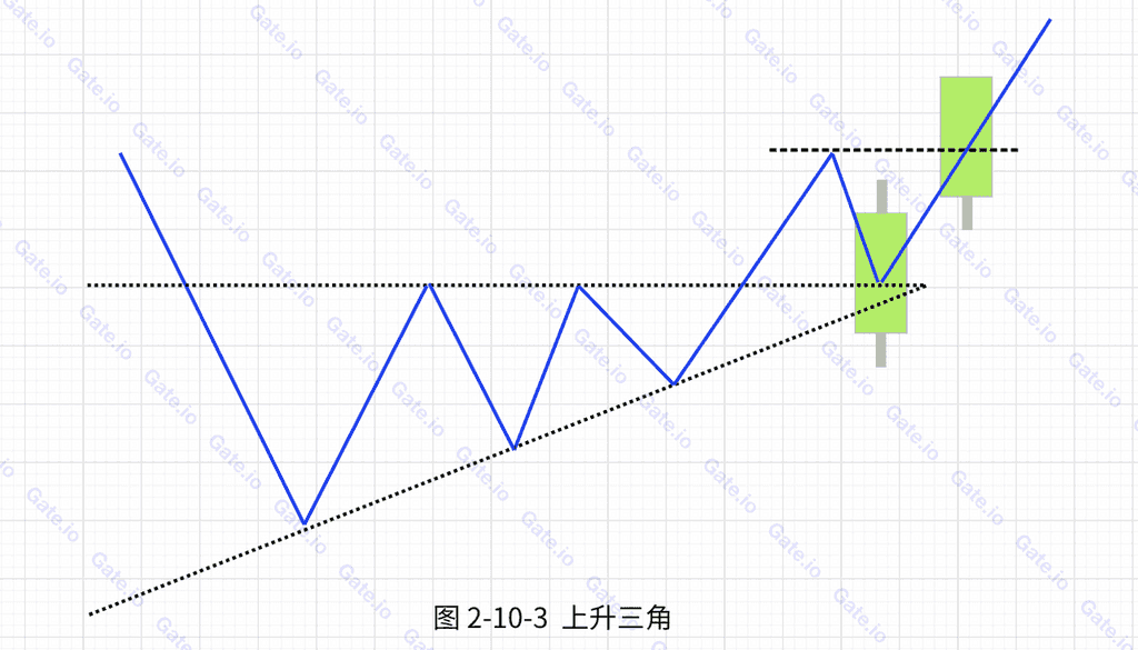 因为币价走出该形态后大多向上突破,预示后市还会继续上涨,所以称为上升三角形。