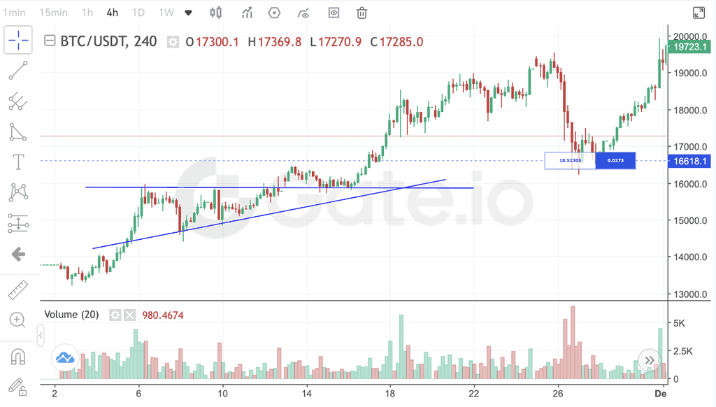 上图是Gate合约 BTC/USDT 4 小时行情图,在 2020-11-5 至 11-12 期间,BTC从 13500 美元上涨至 15800 美元左右,而后震荡真理,走出上升三角形态,当价格突破三角上边线 16000 美元后,开启一波凌厉上涨行情。