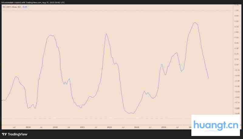 比特币与美元指数(DXY)的52周相关性已经降至-0.25,这是两年来最低水平,显示BTC正逐步摆脱对美元走势的依赖。