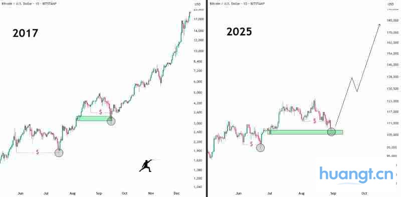 分析师Rekt Fencer就认为,2025年“九月暴跌或将不会发生”,他以2017年的走势作为类比。在2017年,比特币在8月底大幅回落,随后在关键支撑位企稳,并开启了一轮冲向2万美元的强势行情。