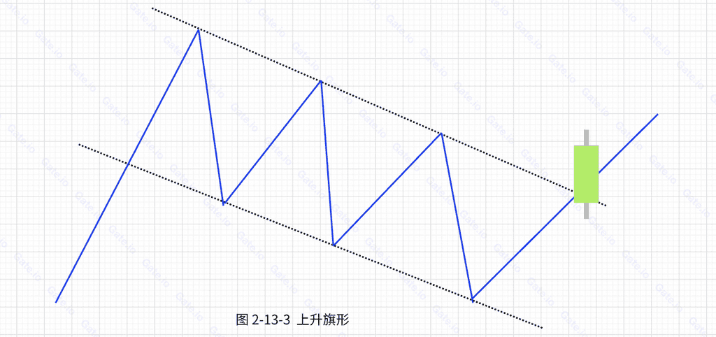 上升旗形突破旗形上边线后,后市看涨,是买入信号。
