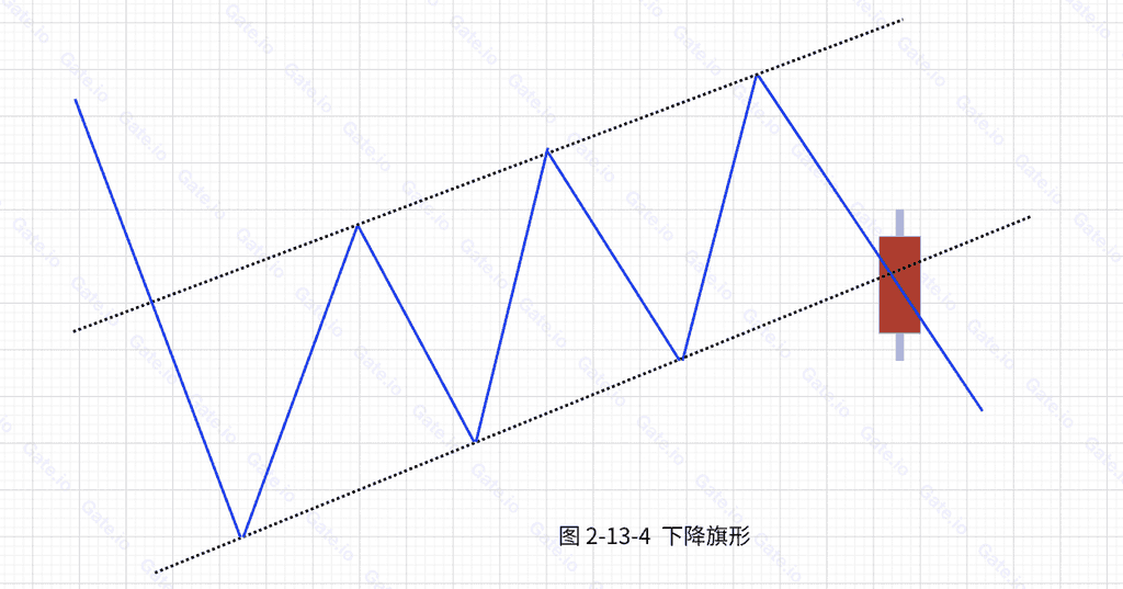 2、币价几乎是以垂直的角度急速下跌,形成旗杆。接着开始反弹,形成一个波动幅度不大、略向上倾斜的价格密集成交区。把密集成交区域的高点和高点、低点和低点分别连接起来,就可以画出两条平行直线,形成旗形的旗面;