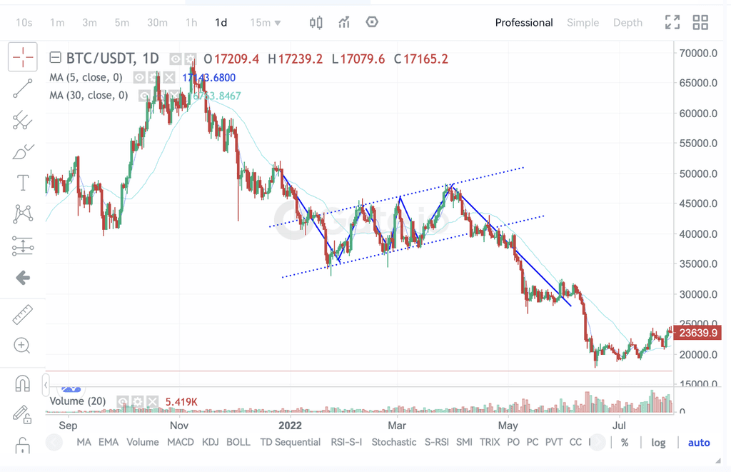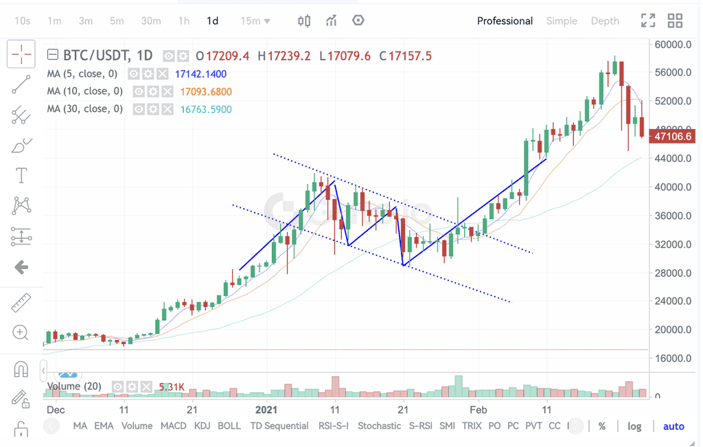 上图是 Gate合约 BTC/USDT 日线图,在 2020-12-28 至 2021-5-13 行情中。BTC 以摧枯拉朽般力量从 69,000 美元跌至 33,000 美元,而后开始整理,在33000-45000 美元反复波动,从结构上,逐步走出一个下降旗形形态,当币价跌破旗形下边线40,000 美元后,快速下跌最低触及 17,000 美元。