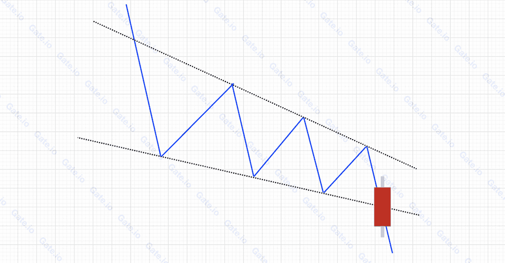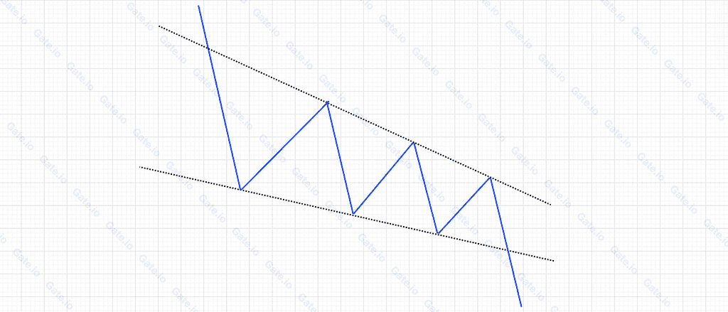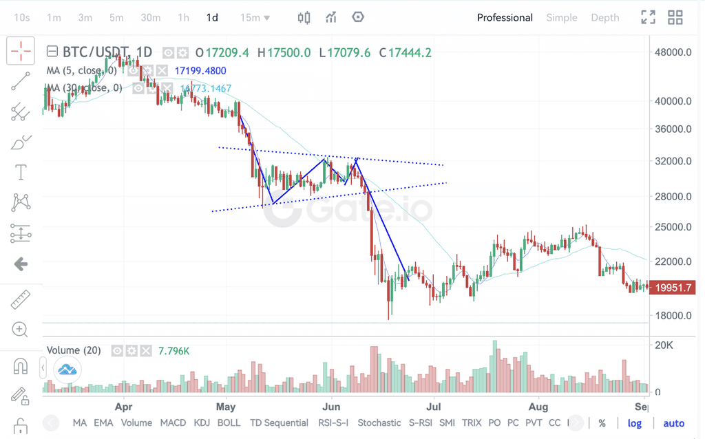 上图是 Gate合约 BTC/USDT 日线图。在 2022-5-5 至 2022-6-18 行情中,在一轮急速下跌后,横盘整理最后走出下降楔形。当币价跌破楔形的下边线29,500 美元后,开启新一轮下跌最低触及17,800 美元,跌幅高达42%。