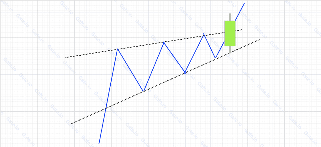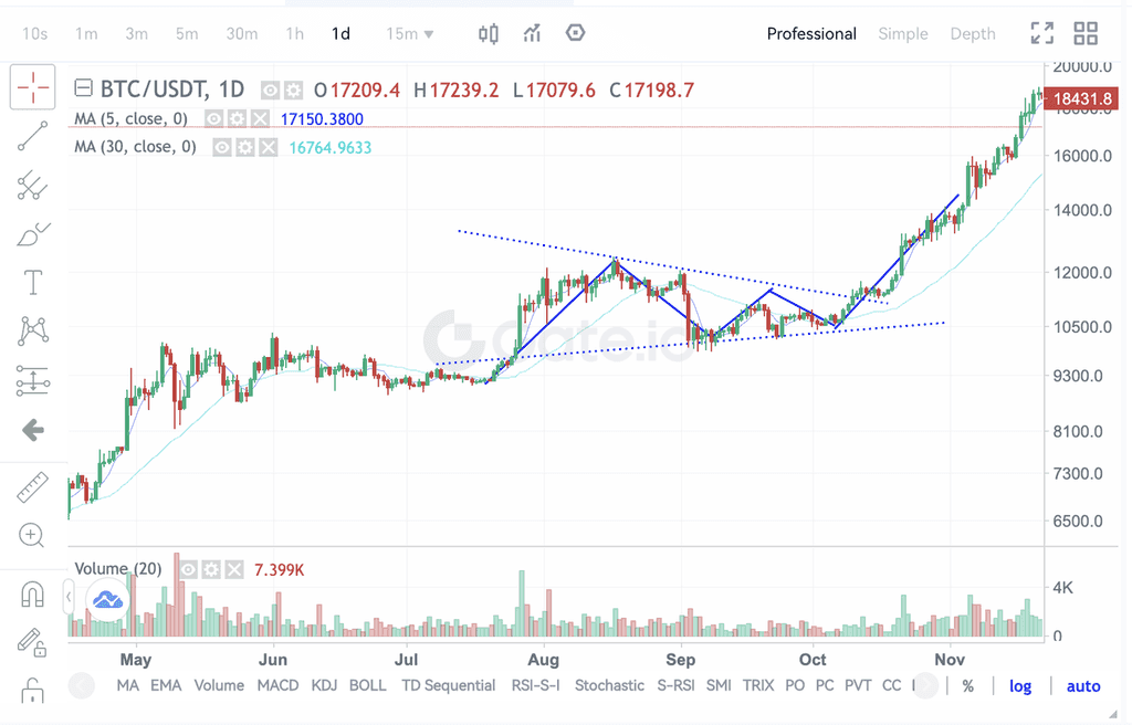 上图是 Gate合约 BTC/USDT 日线图。在 2020-6-1 至 2020-11-1 行情中,经过一轮上涨行情后,开启区间波动,在结构上走出了上升楔形形态。随后,币价拉升突破11,000美元,在突破楔形上边线后开启新一轮涨势,最高突破 20,000 美元,累计涨幅高达107%。