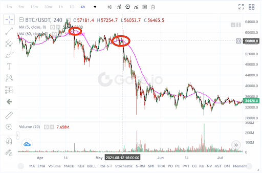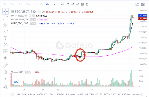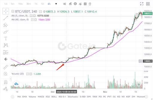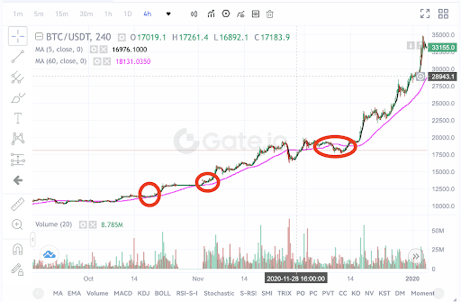 3、60 日均线作为中长期趋势的定性线,在大部分情况下具有指示和确认趋势的作用。60 日均线上行表明币价处于牛市中,此时可以适当满仓。
