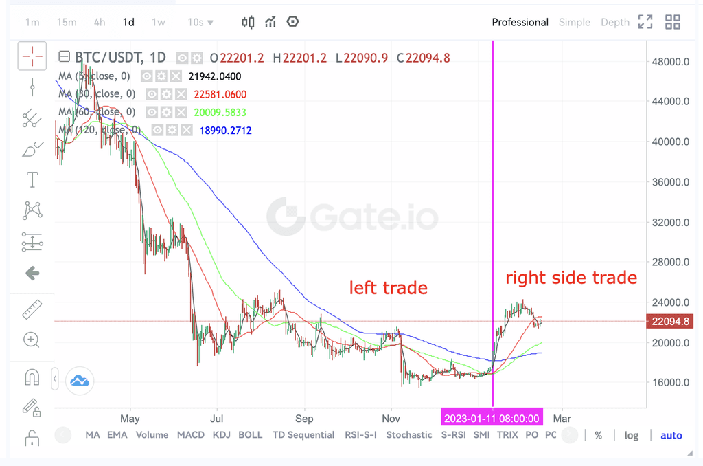 3、左侧交易入场时的币价运动方向和期望的方向相反;右侧交易入场时的币价运动方向和期望的方向相同。