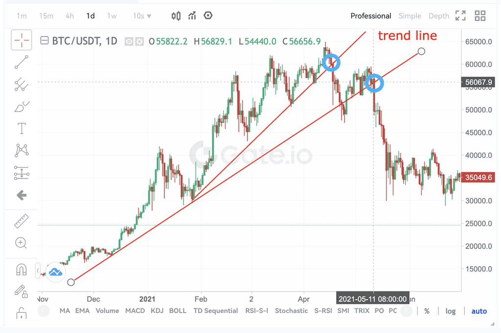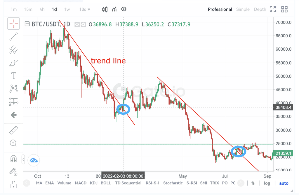 2、币价向下突破上升趋势线时,是见顶信号,卖出;