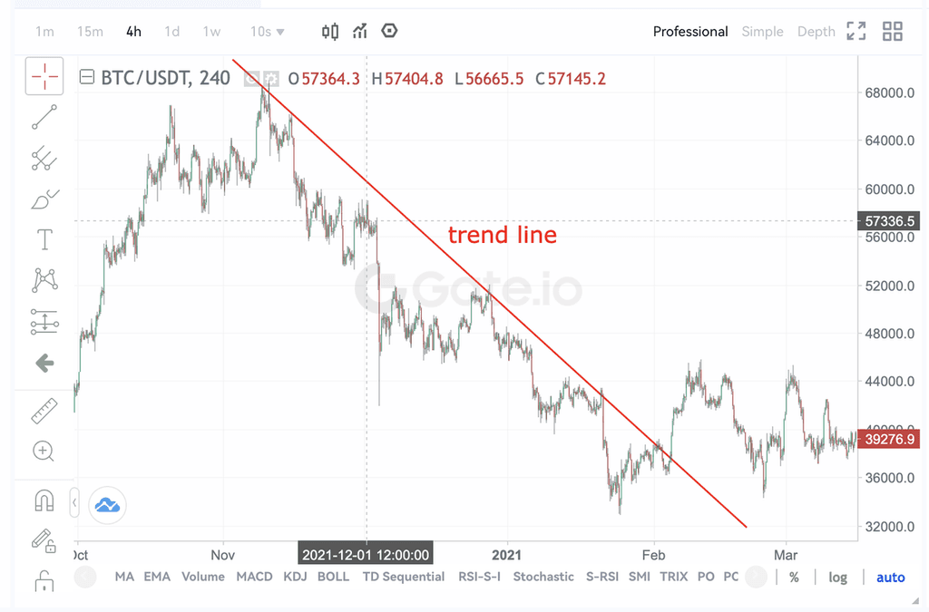 下降趋势线是指在某一时间段内,连接币价最高点或相对高点与该时间段内最低点之前的任意高点,中间不被任何币价有效穿越的直线。如下图: