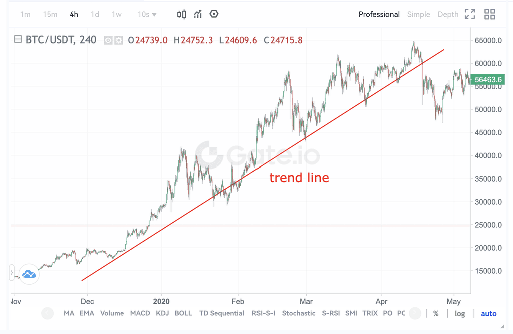 上升趋势线是指在某一时间段内,连接币价最低点或相对低点与该时间段内最高点之前的任意低点,中间不被任何币价有效穿越的直线。如下图: