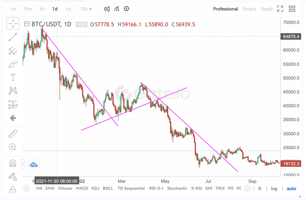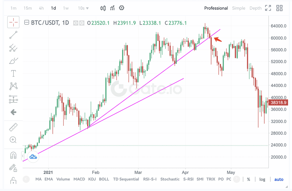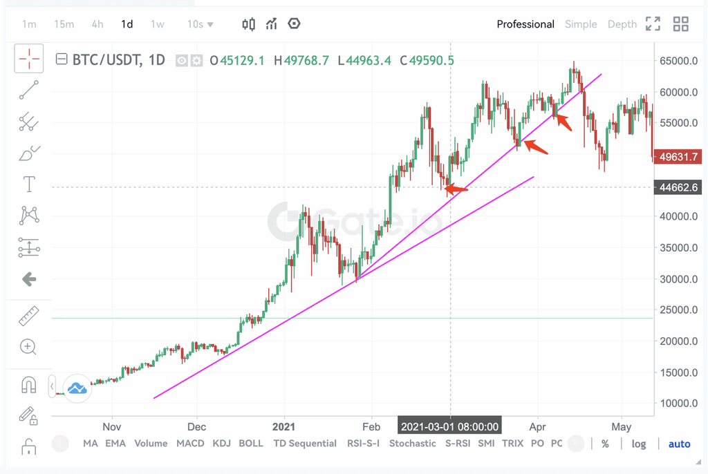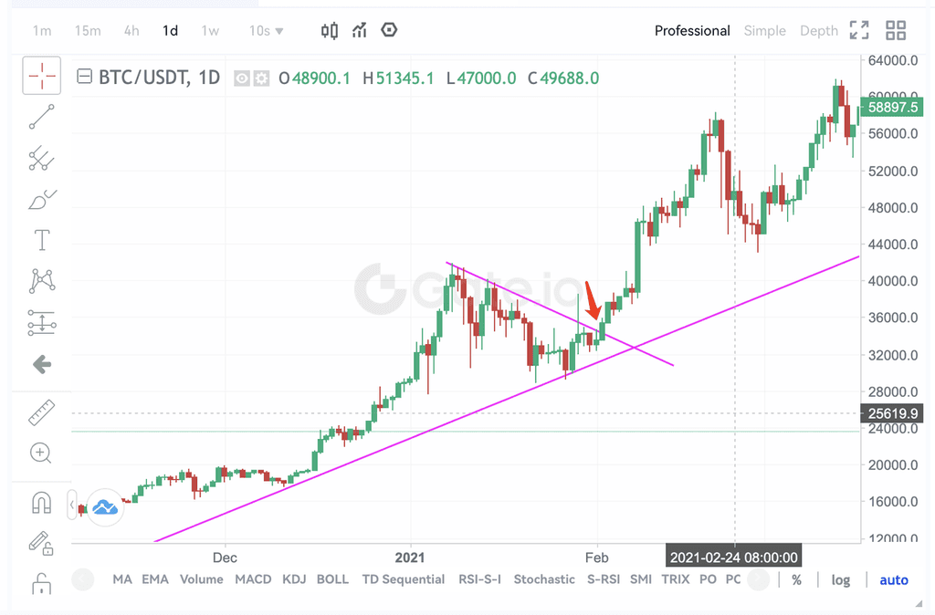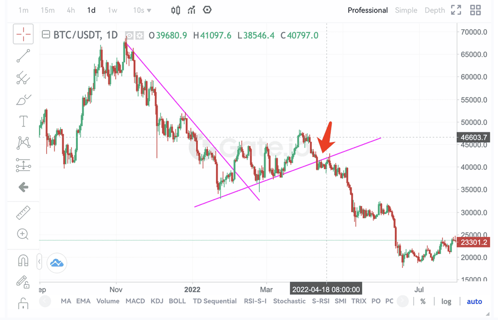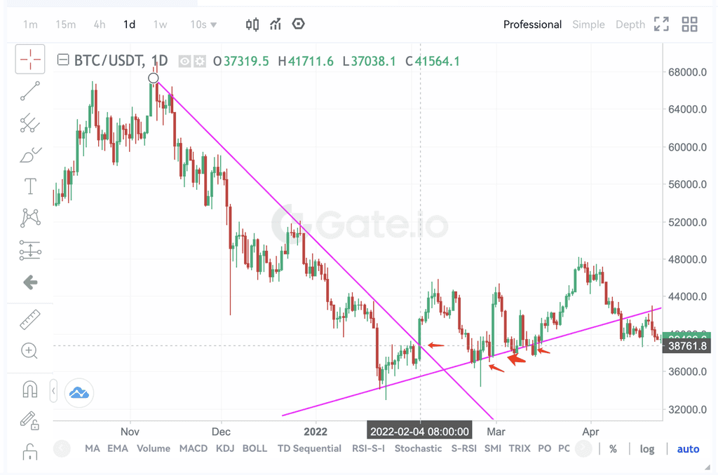 4、币价突破长期下降趋势线,回落跌破中期上升趋势线,减仓或清仓。