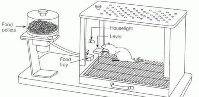 其基本结构:在箱壁的一边有一个可供按压的杠杆,在杠杆旁边有一个承受食物的小盒紧靠着箱壁上的小孔,小孔外是食物释放器,其中贮有颗粒形食物。动物在箱内按一下杠杆,即有一粒食物从小孔口落入小盒内,动物可取食。