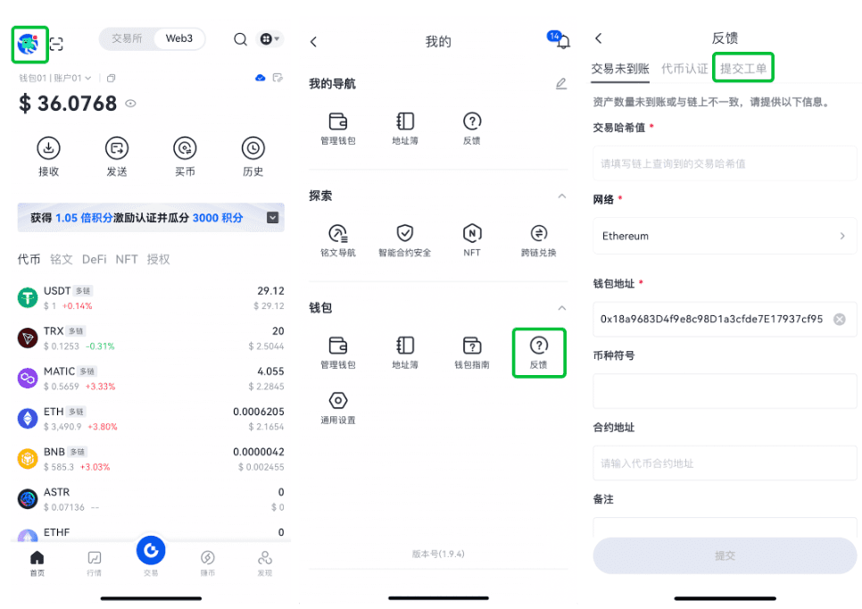 如您在使用钱包App端时遇到问题,可点击Web3首页左上方头像-点击【反馈】-选择【提交工单】,输入您的问题即可。