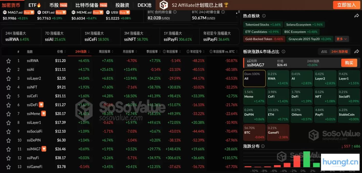 反映板块历史行情的加密板块指数显示,ssiRWA、ssiAI、ssiLayer2 指数分别上涨6.45%、4.17%、4.04%。