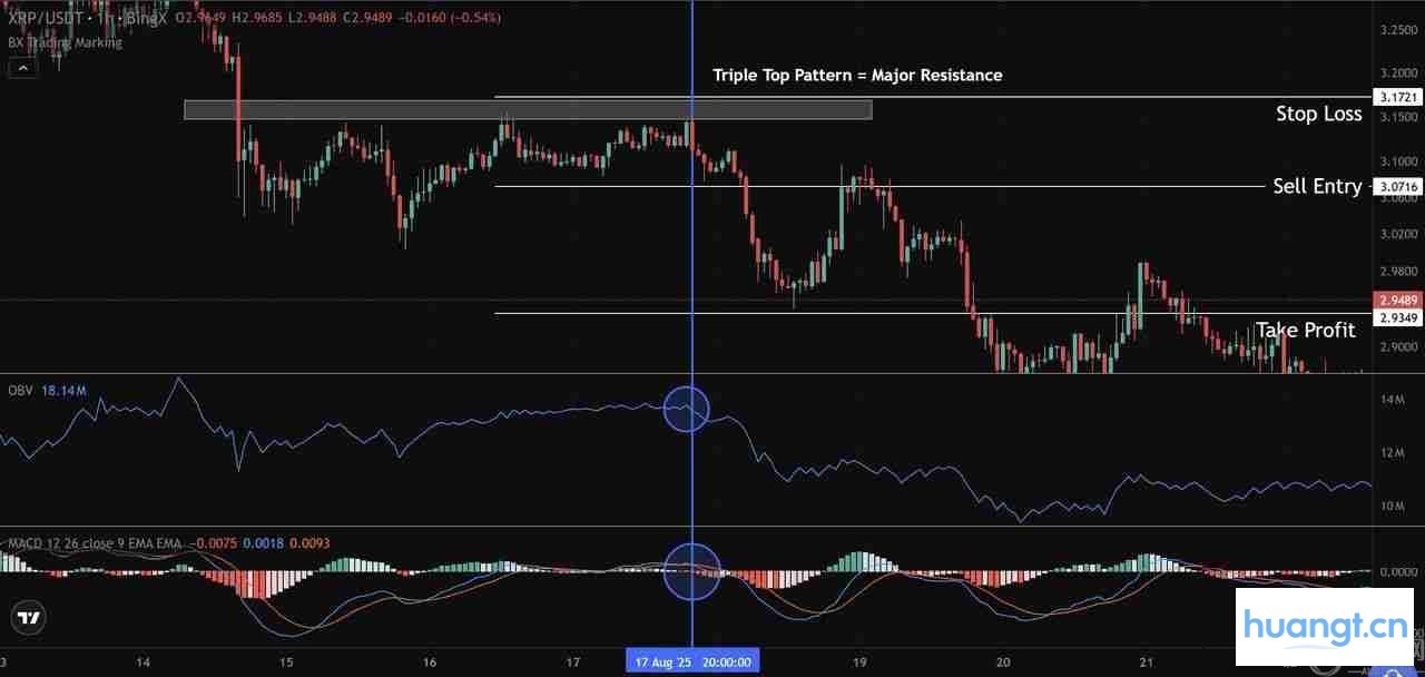 在上方 XRP/USDT 图表中,OBV 向上突破,同时 RSI 从超卖区 30 附近反弹并突破 50。这种双重信号证实了强劲的买盘压力,让交易员有信心在 2.90 美元附近进场,目标价约为 3.09 美元,止损价为 2.77 美元。