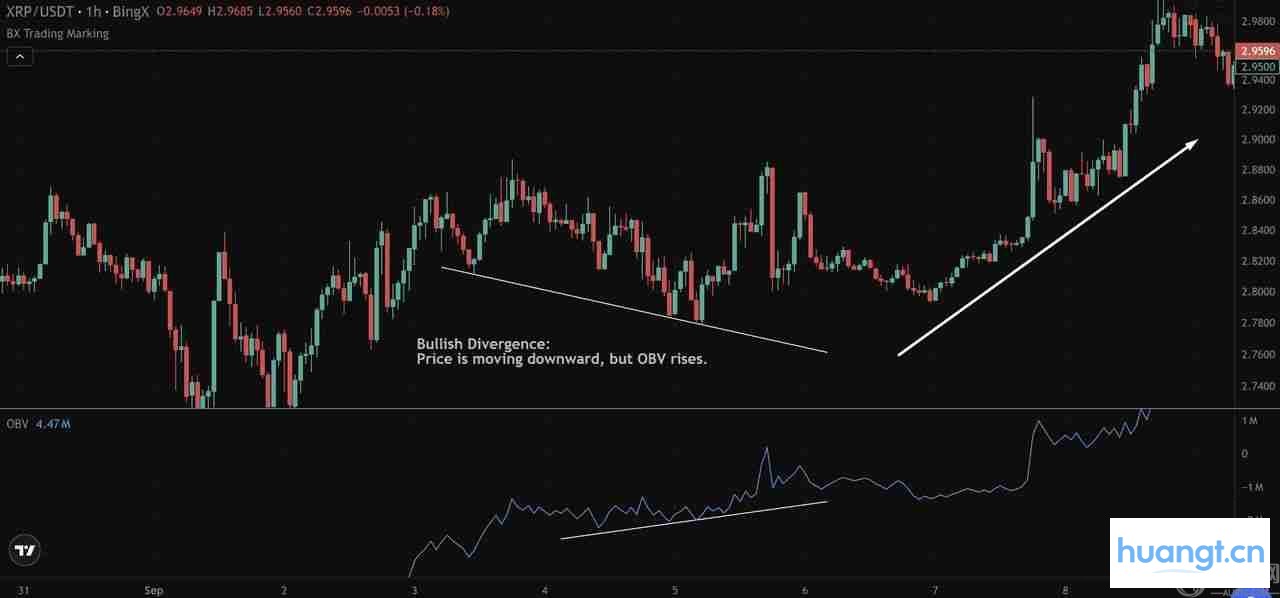 当价格走低而平衡成交量(OBV)线上升时,就会出现看涨背离。这在价格行为和成交量流向之间造成了不匹配。虽然价格在图表上看起来很弱,但 OBV 显示买盘压力正在悄悄增加,通常预示着可能出现向上的趋势反转。