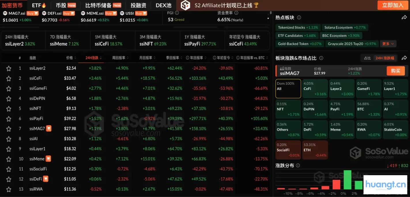 此外,CeFi 板块 24 小时上涨 3.16%,板块内,Binance Coin(BNB)上涨 3.94%,盘中一度突破 960 美元,创历史新高。表现亮眼的板块还包括:Layer2 板块 24 小时上涨 3%,其中,Mantle(MNT)上涨 7.27%;GameFi 板块上涨 1.78%,ImmutableX(IMX)上涨 7.54%;Layer1 板块上涨 1.75%,Sui(SUI)上涨 2.27%。其他板块方面,PayFi 板块上涨 1.59%,板块内,Monero(XMR)上涨 3.83%;DeFi 板块上涨 0.59%,MYX Finance(MYX)盘中冲高 16.6%;Meme 板块上涨 0.54%,dogwifhat(WIF)上涨 8.3%。