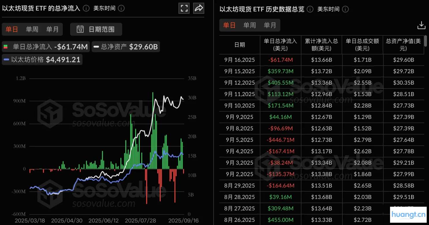 huangt 消息,根据 SoSoValue 数据,昨日(美东时间 9 月 16 日)以太坊现货 ETF 总净流出 6174.35 万美元。