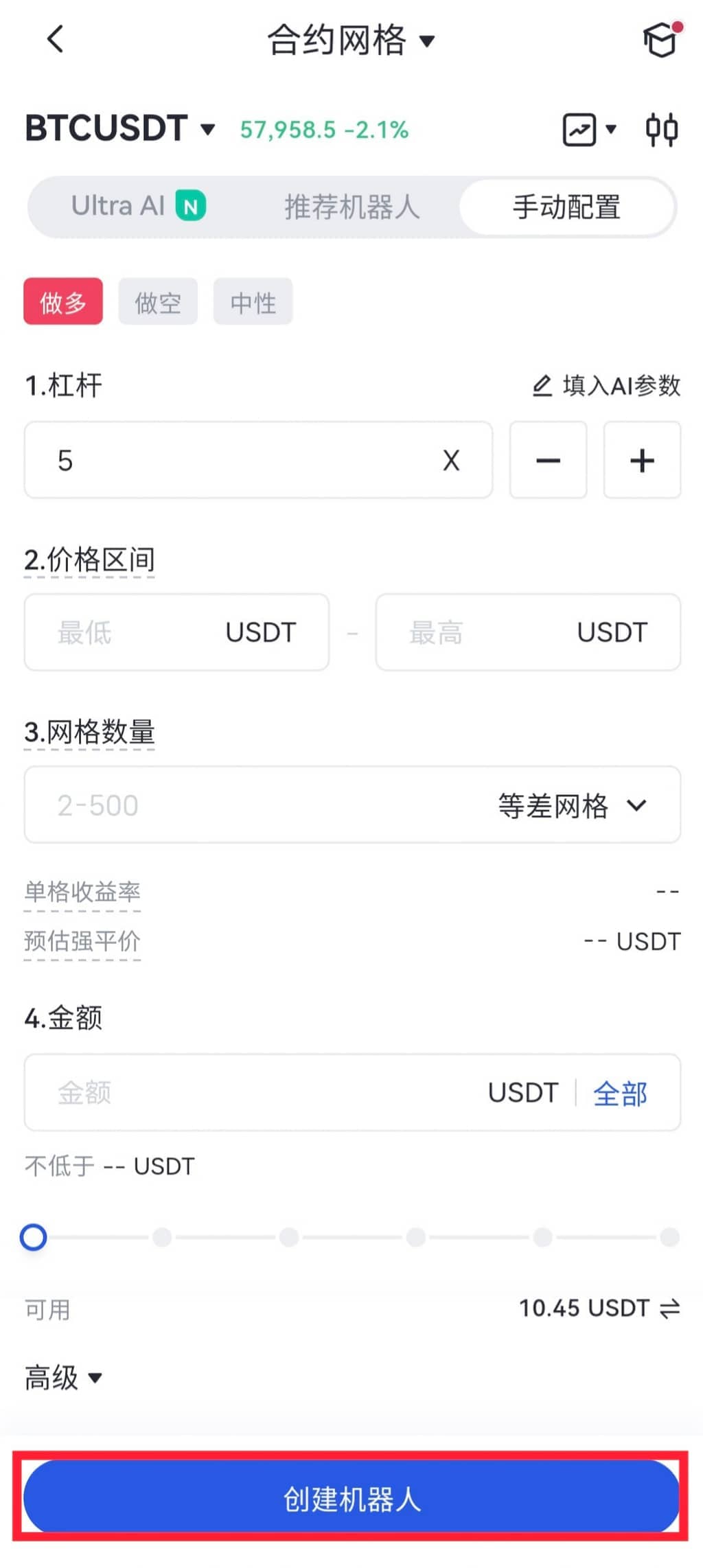 进入交易机器人主页 - 创建机器人 - 合约网格 - 选择交易对 - 推荐机器人/手动配置网格 - 创建机器人