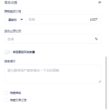 自动止损比例:持仓均价与标记价格相差比例跌破自动止损比例时触发止损,将市价平仓,终止策略。