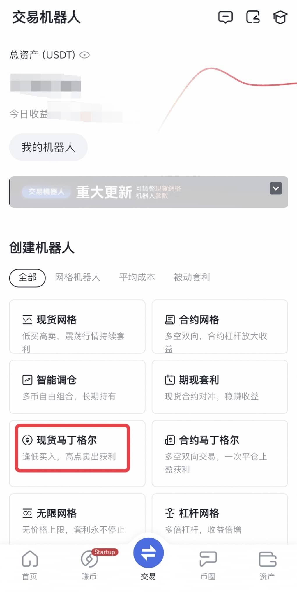 交易机器人主页—创建机器人—现货马丁格尔—配置参数—创建