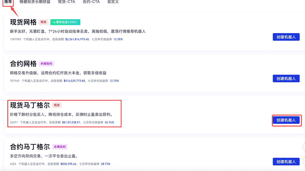 1.跟单创建:您可在推荐机器人板块筛选出优质用户或机器人,并复制创建;