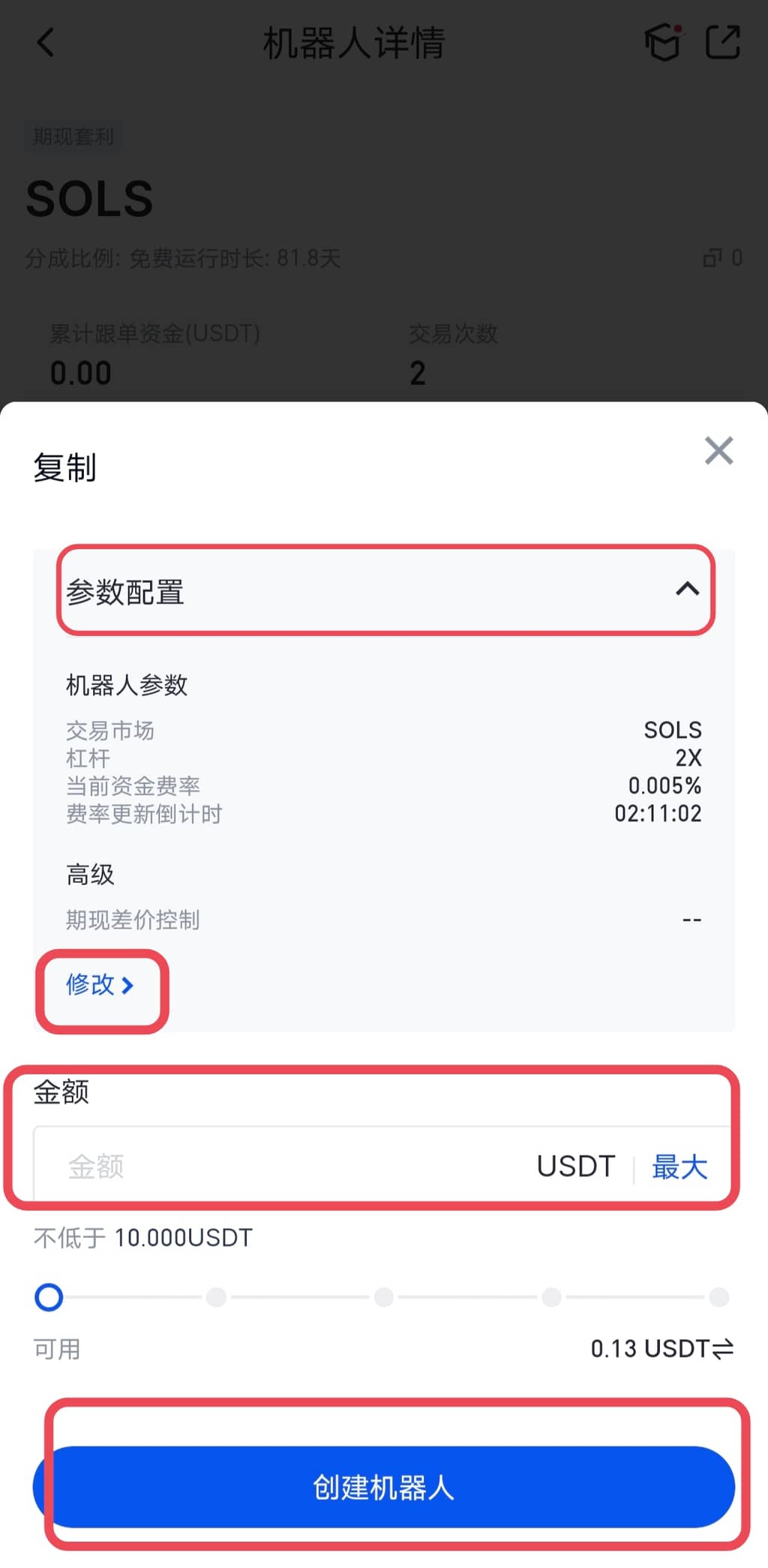 导航栏—交易机器人—机器人广场—创建机器人—稳健投资长期获益分页—期现套利—创建机器人—配置参数—点击创建