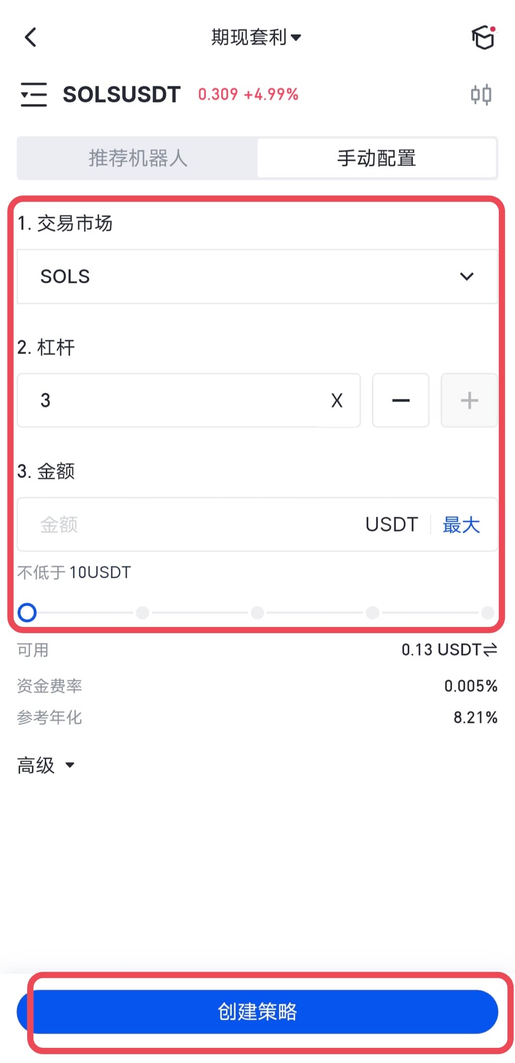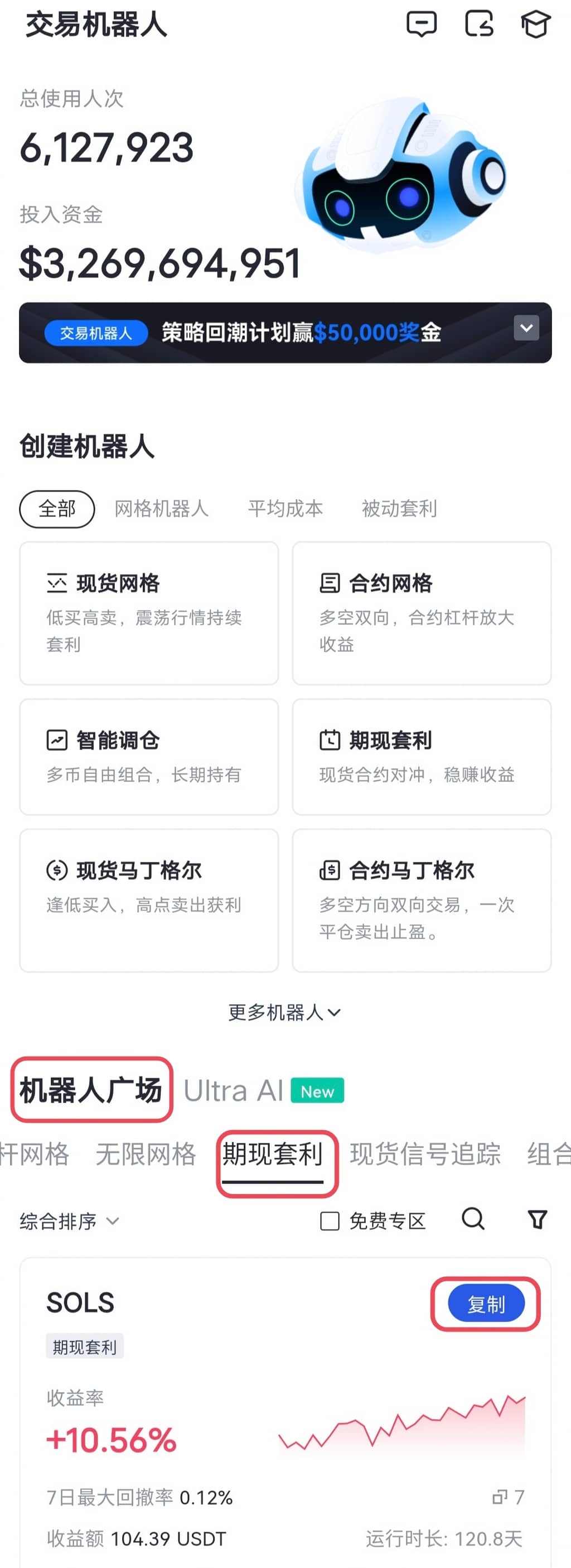 左上角头像—交易—交易机器人—机器人广场—期现套利—复制—配置参数—点击创建