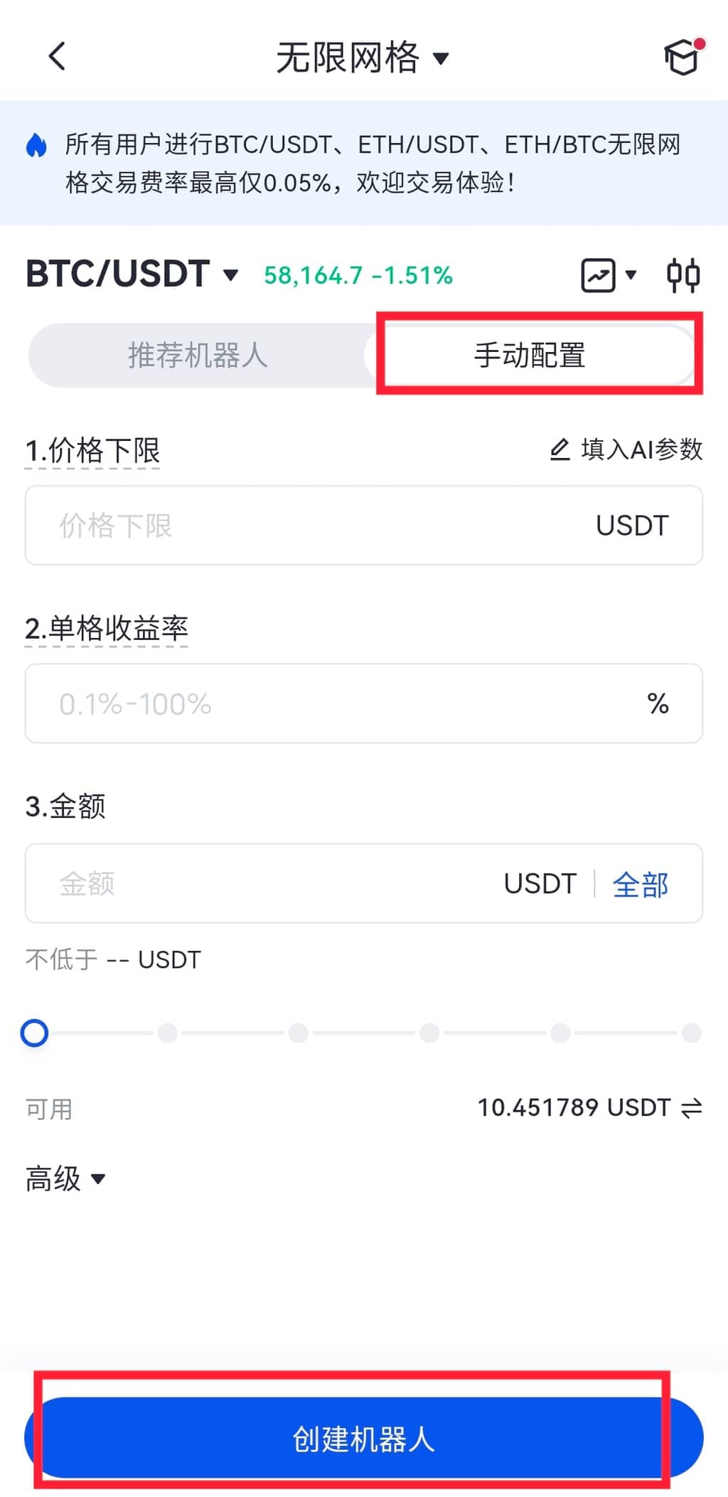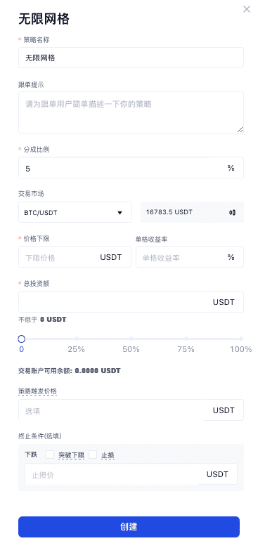 3.自定义创建:您可根据自己对市场的判断,配置价格下限,单格收益率以及金额/币种来设置无限网格机器人。
