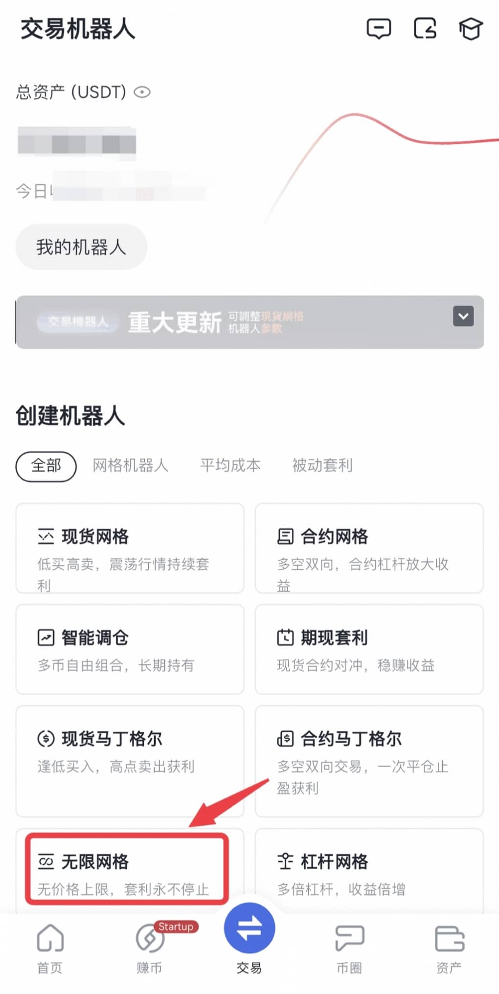 交易机器人主页—创建机器人—无限网格—创建机器人—选择交易对—配置参数—点击创建机器人。