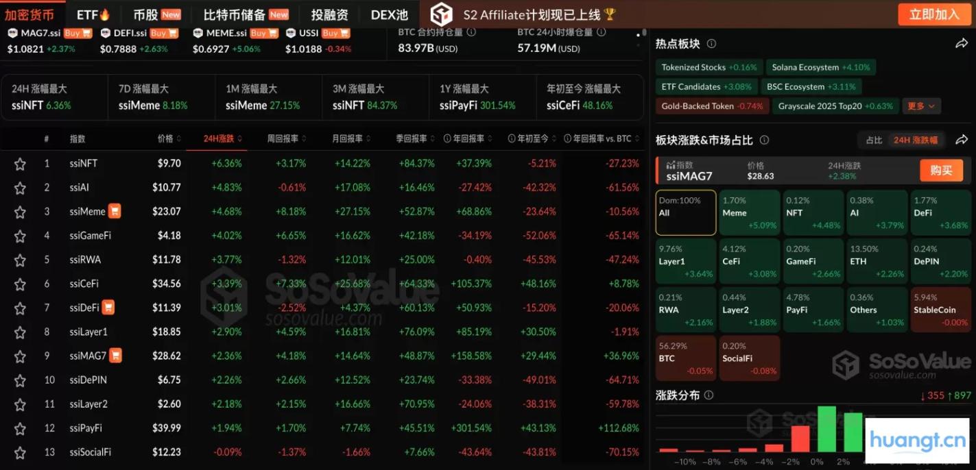受此利好影响,加密板块普遍上涨,其中,Meme 板块24小时上涨5.09%,板块内,MemeCore(M)大幅上涨18.49%,Pump.fun(PUMP)上涨7.13%。此外,Ethereum(ETH)上涨2.26%,突破4600美元。但 Bitcoin(BTC)小幅下跌0.05%,维持在11.6万美元附近。与此同时,MAG7.ssi 上涨2.37%,DEFI.ssi 上涨2.63%,MEME.ssi 上涨5.06%。