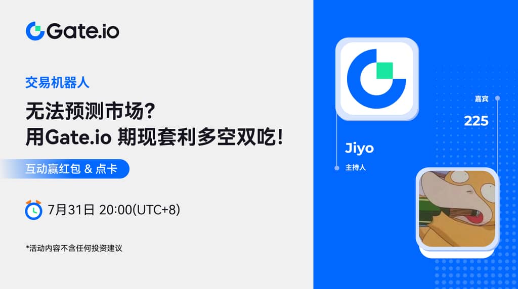 Gate交易机器人将于7月31日20:00(UTC+8)举办专题分享会,聚焦加密市场的期现套利策略,帮助用户深入理解如何通过期现套利机器人实现低风险套利,优化投资策略,特邀资深交易专家进行行情分析与交流,直播过程中还有红包雨活动,参与者可获得$10 Gate点卡奖励,新用户在直播当天注册并观看满10分钟即可获得VIP+1(7天)奖励,邀请新用户共同观看也可享受同等奖励,活动期间需完成KYC2认证,奖励将在活动结束后14个工作日内发放,更多信息请关注直播链接,加入官方社群或联系客服咨询,安全、便捷地交易超过1400种加密货币,欢迎新用户注册Gate平台,老用户推荐他人注册可获得40%佣金。
