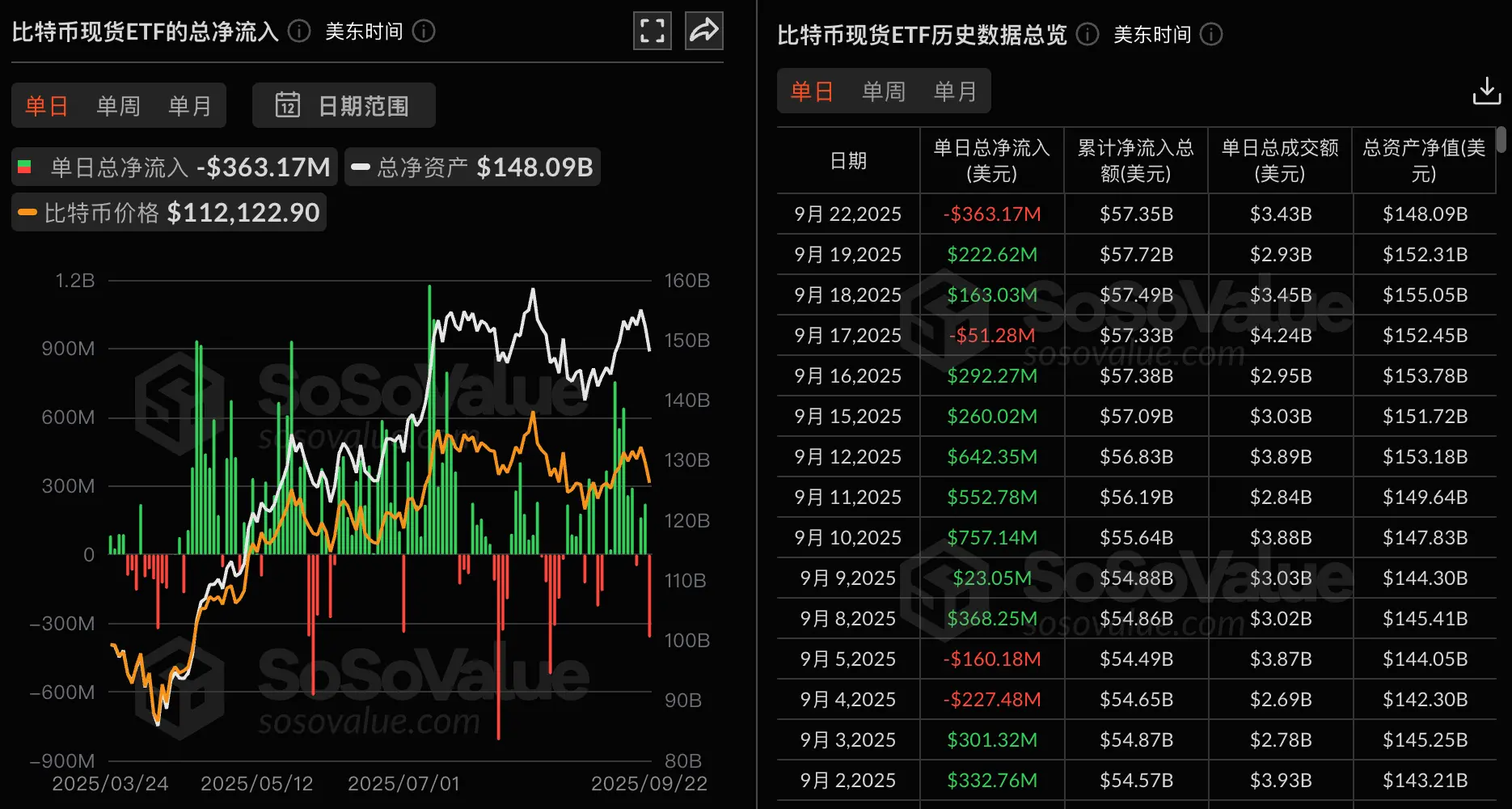 huangt 消息,根据 SoSoValue 数据,昨日(美东时间 9 月 22 日)比特币现货 ETF 总净流出 3.63 亿美元。