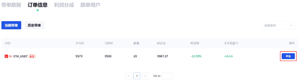 可以进入【带单模式】页面,在订单信息-当前带单列表中,点击【平仓】按钮将立即以市价平仓该合约,平仓后的历史订单会显示在历史订单中。