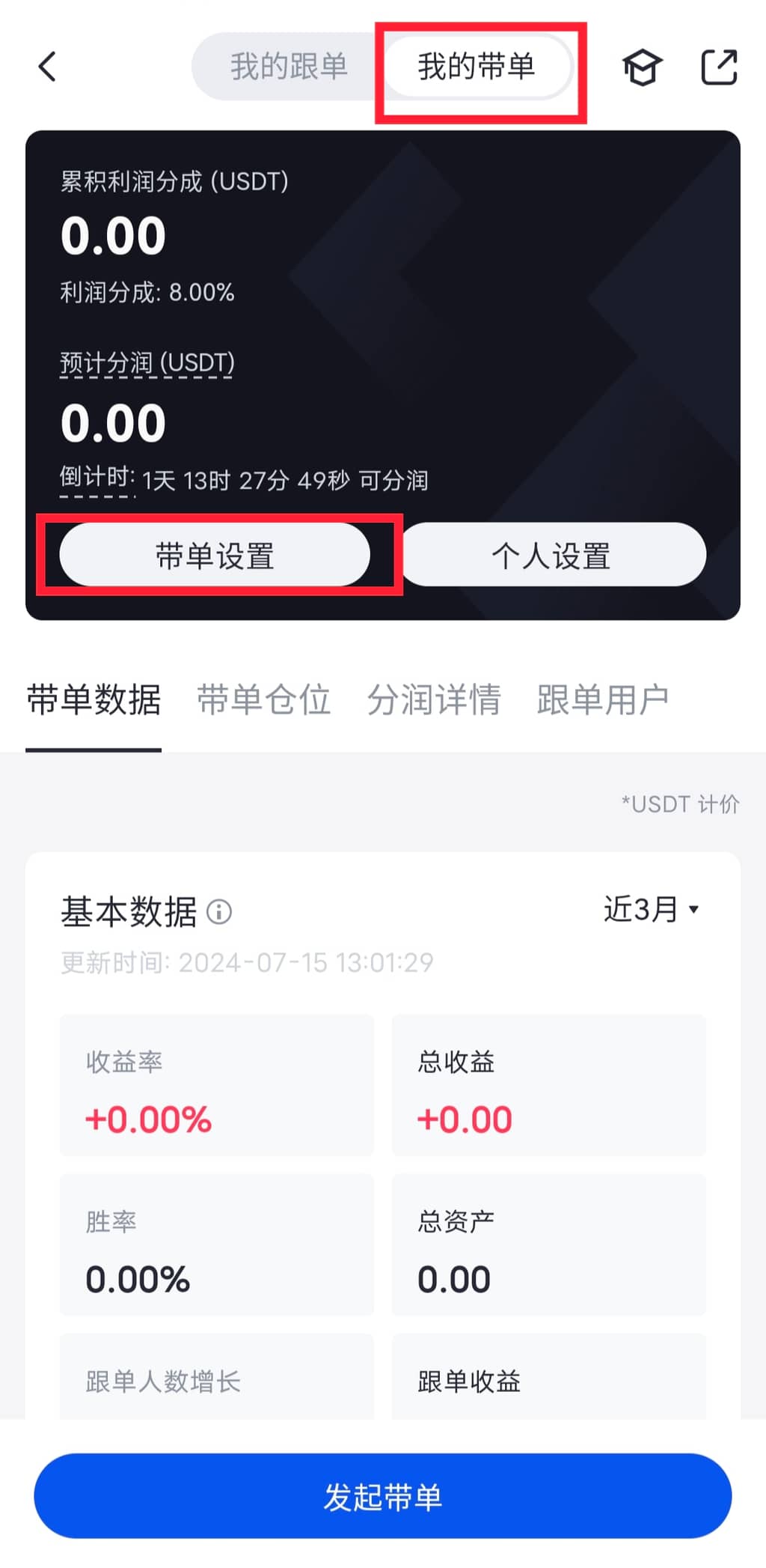 WEB端:上方导航栏跟单>合约跟单>点击【发起带单】>配置带单参数,即可开启带单交易