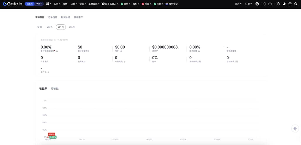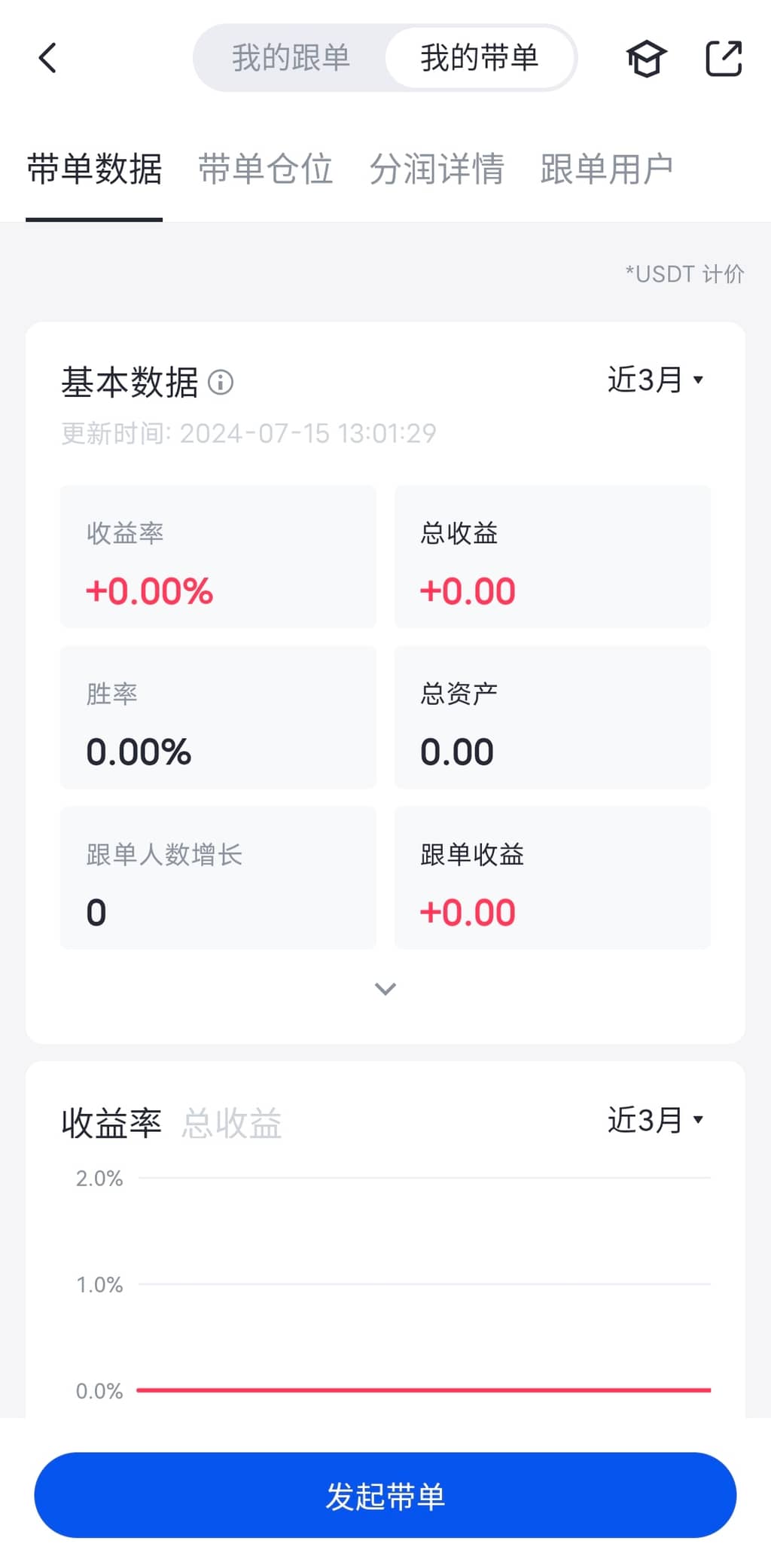 开启带单交易后,可在【我的带单】中查看带单信息:包括带单数据、订单信息、利益分成、跟单用户数据等;