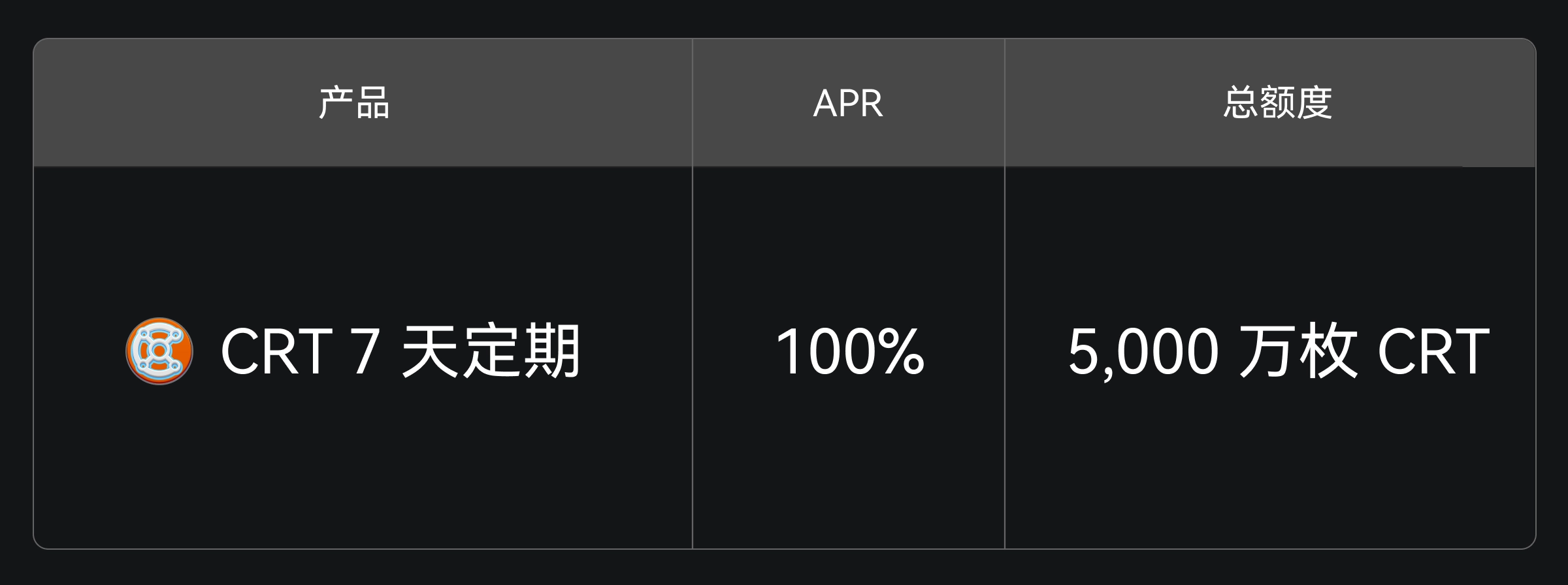 Gate 余币宝重磅上线 CRT 7 天定期理财,年化收益 100%,总额度 5,000 万枚 CRT,限量发售,先到先得。