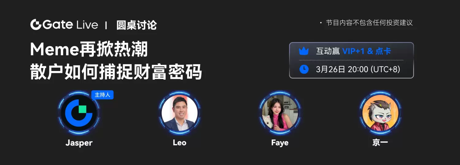 GateLive将于 3月26日 20:00(UTC+8)举办直播栏目《圆桌讨论》。我们将邀请三位区块链研究员, 深入剖析近期备受关注的Meme赛道,探讨其4月的发展趋势及潜在交易策略。观看直播,直播间免费领空投: