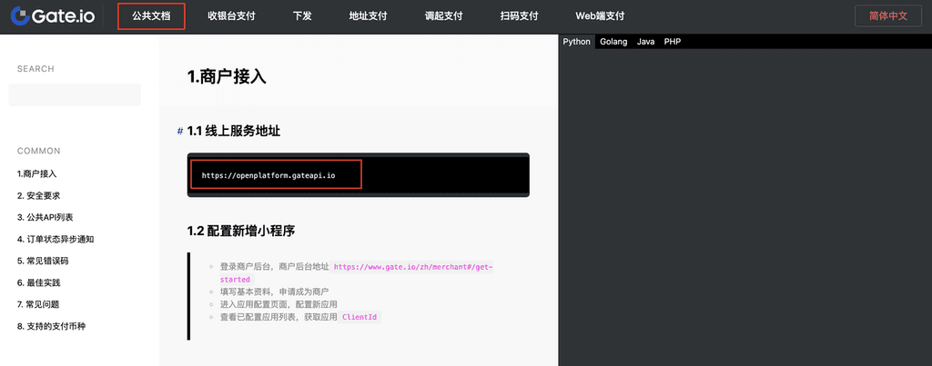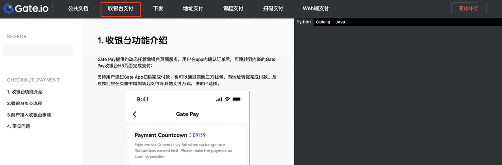 6.审核通过后,请按照API文档来进行支付的接入测试:https://www.gatenode.ch/docs/gatepay/common/zh_CN/
