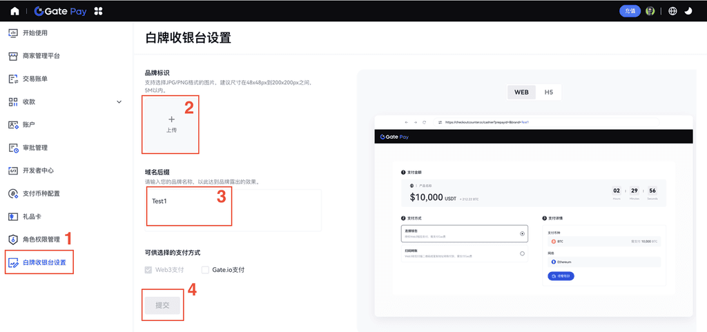 5.点击【白牌收银台设置】,申请白牌权限。需上传【品牌标识】和【域名后缀】展示商户品牌。最后点击【提交】,等待审核通过。