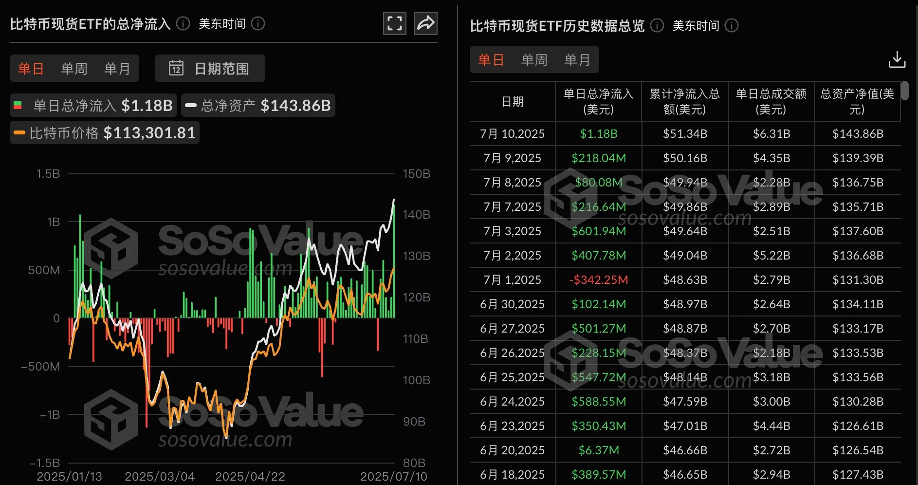 huangt 消息,根据 SoSoValue 数据,昨日(美东时间 7 月 10 日)比特币现货 ETF 总净流入 11.79 亿美元。