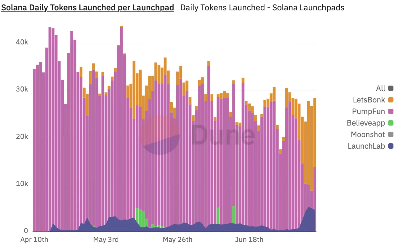 自2024年1月上线以来,Pump.fun已累计收入近6.7亿美元,其中单日手续费峰值则接近 700万美元 。这曾让其一度垄断Solana生态MEME代币发射平台的霸主地位。然而,就在PUMP即将发行之际,竞争对手letsbonk.fun强势崛起。letsbonk.fun以15,600次代币发行超过Pump.fun的11,500次,以49.8%的市场份额颠覆前者40.9%的垄断地位,这是自2024年1月以来,Pump.fun首次在Solana MEME市场份额上被对手超越。尽管随后Pump.fun重新回到市场第一的位置,但这次被超越的经历引发了市场对其垄断地位的质疑,也显示出其在短期内存在被其他平台替代的可能性。