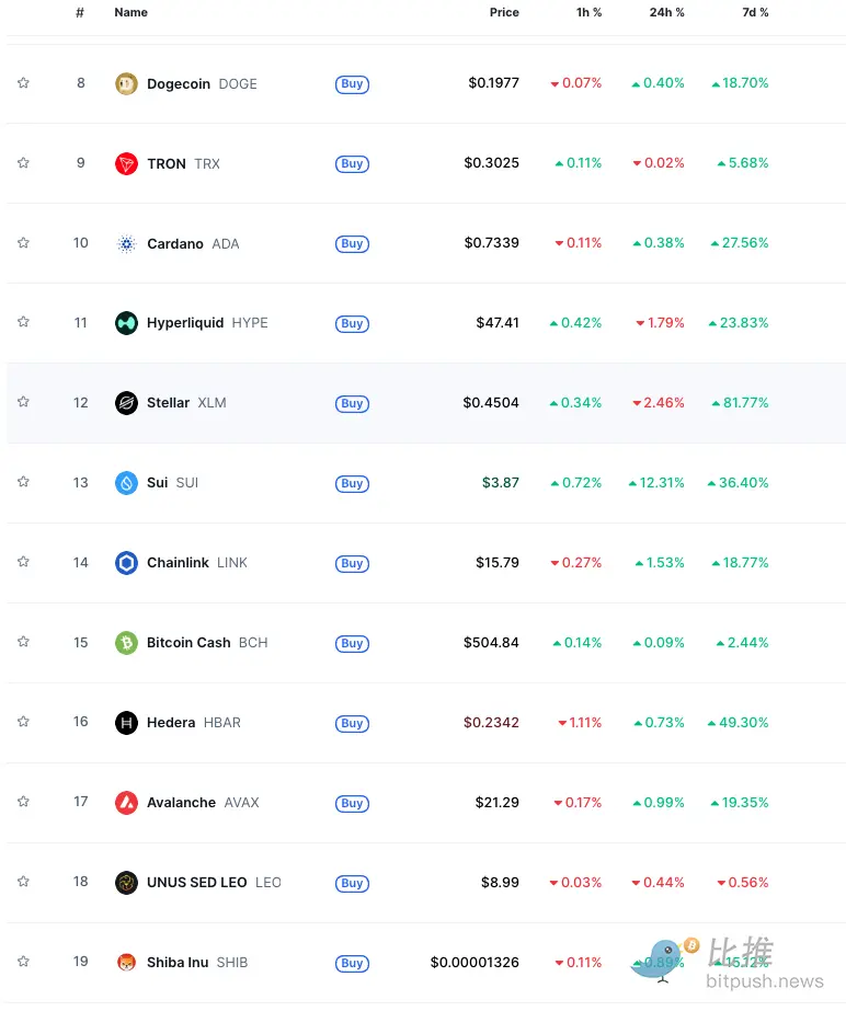CMC 市场数据显示,在市值前 20 位的加密资产中,部分「元老级」第一层(L1)山寨币表现突出,7 日涨幅普遍达到两位数。其中领跑者是 Stellar(XLM):作为市值排名第 12 位的加密资产,周涨幅高达 82%,在同类资产中处于领先地位。市值排名第 10 位的 ADA 7 日涨幅近 30%;瑞波(XRP)29%;狗狗币(DOGE)18%。