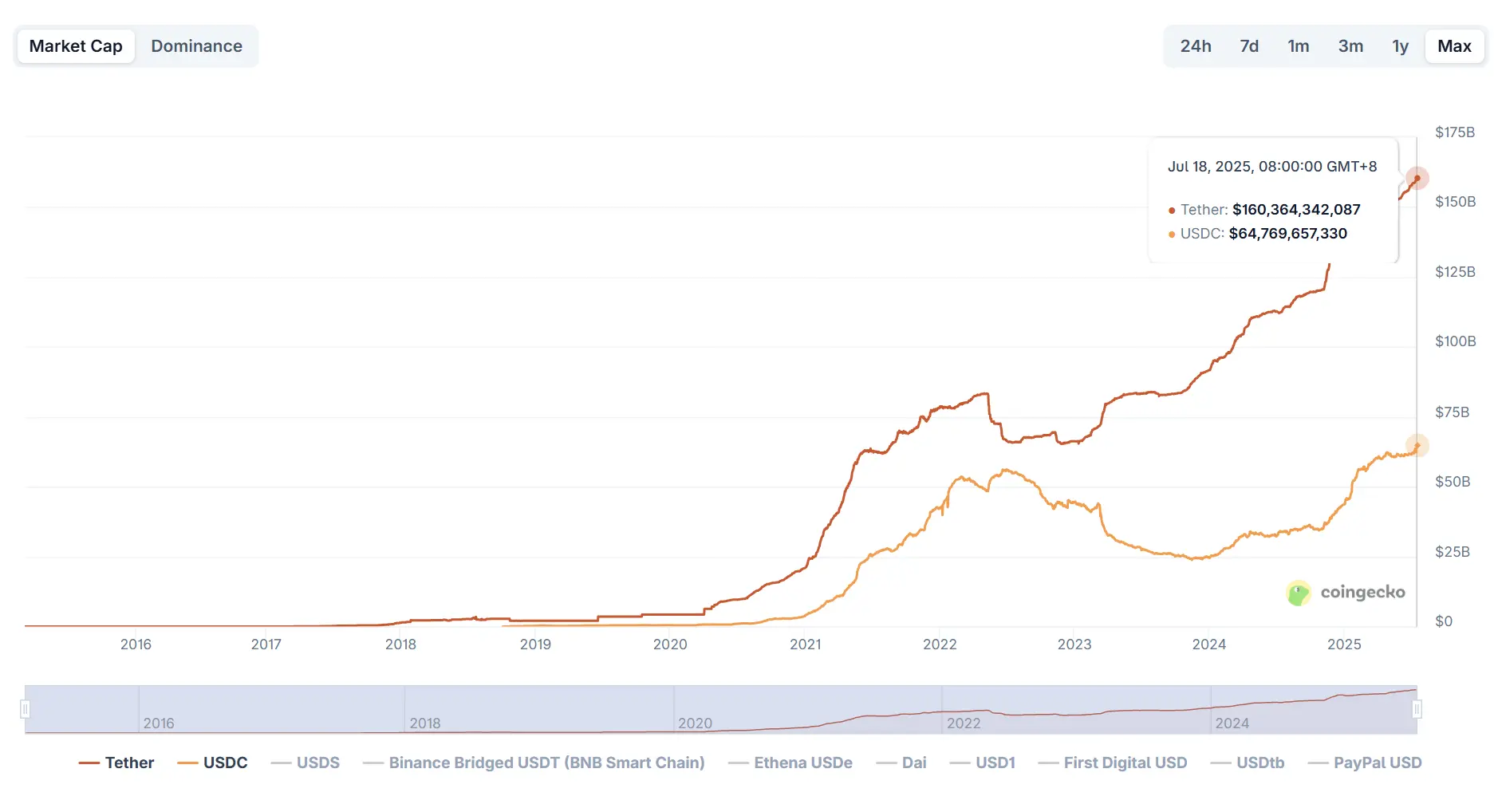 而从整体规模看,2025 年以来,稳定币仍保持增长态势——根据 CoinGecko 数据,截至 7 月 18 日,全网稳定币总市值约为 2620 亿美元,相比年初增长超过 20%。