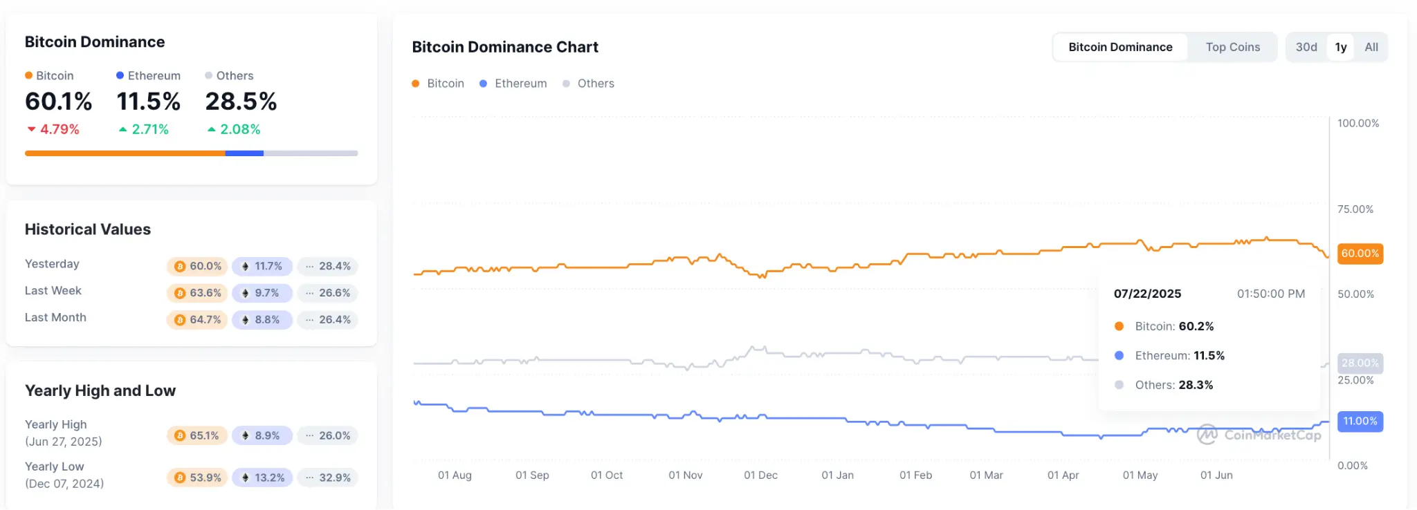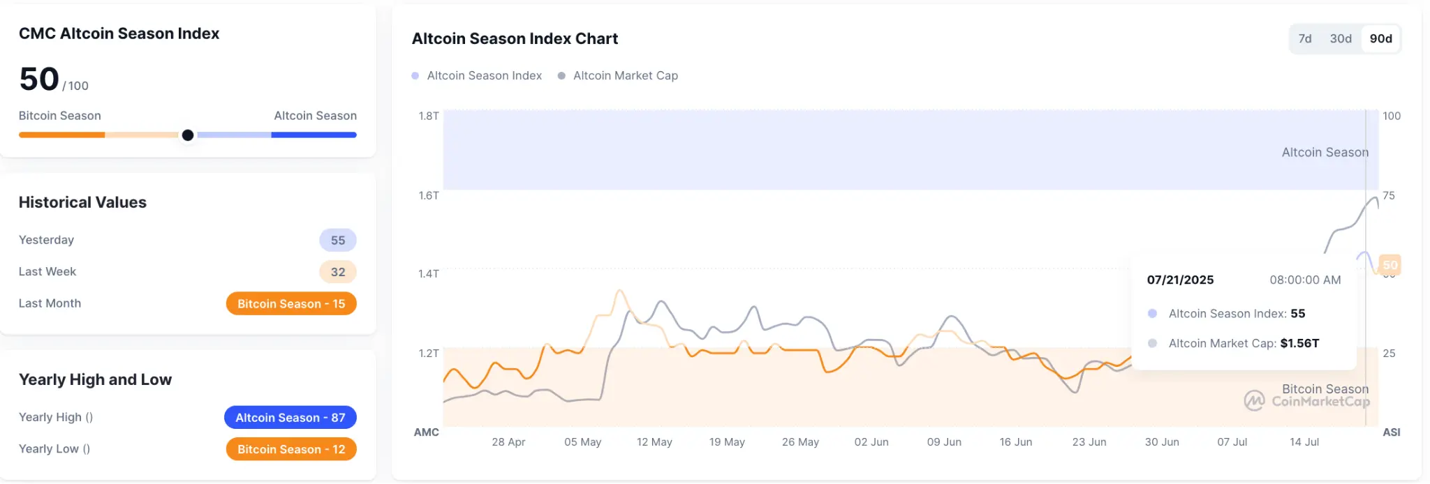 Coinmarketcap数据显示,比特币市占率出现持续回落,现报60.1%,创下今年3月以来新低。与此同时,山寨币季节指数(Altcoin Season Index)上涨,7月21日最高涨至55,现报 50。该指数显示在过去 90 天内,市值前 100 加密货币中约 50 个项目涨幅超越比特币。