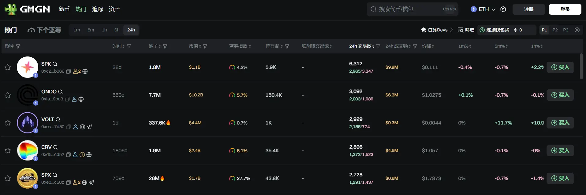 过去 24h 以太坊热门代币前五依次为:SPK、ONDO、VOLT、CRV、SPX